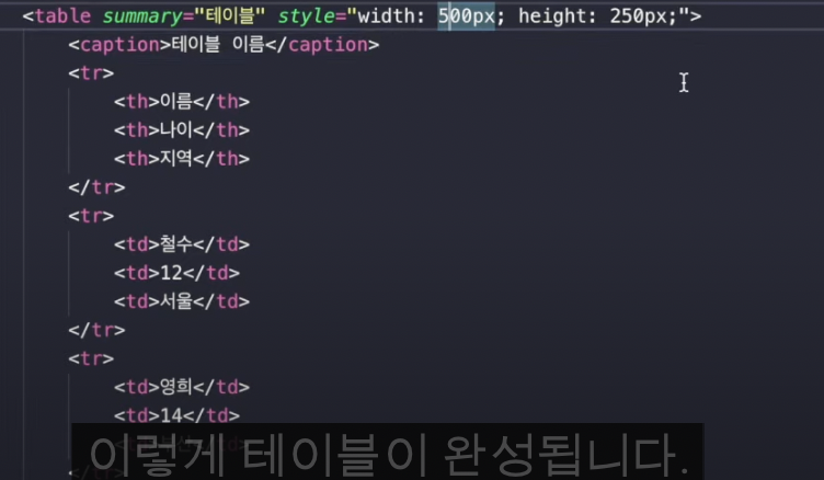 여기서 caption태그는 테이블의 이름을 정의한다.